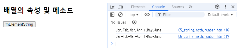 - 이것도 문자들을 합치고 컴마로 구분함. 차이점은 합쳐질 때 구분자를 제시할 수 있는 것이 toString과의 차이점.