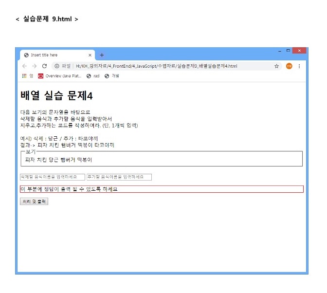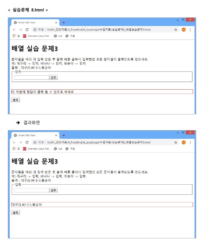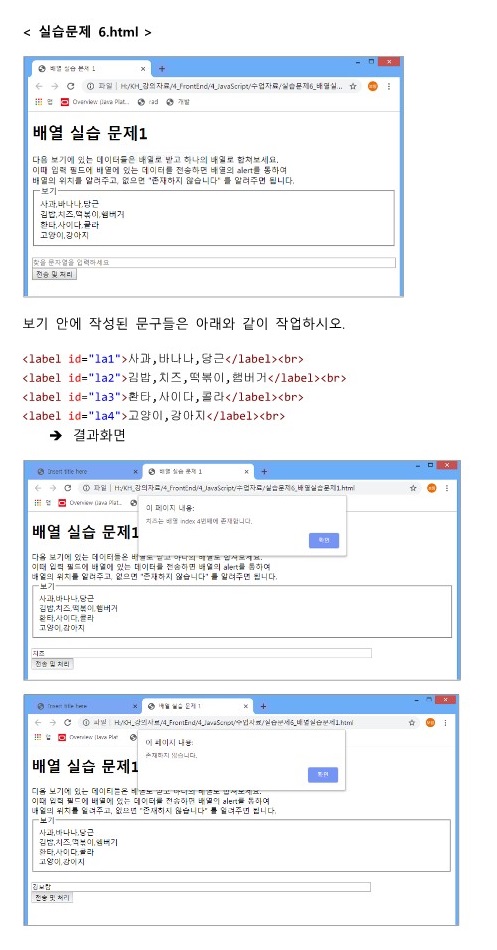 이때 입력 필드에 배열에 있는 데이터를 전송하면 배열의 alert를 통하여 < br >