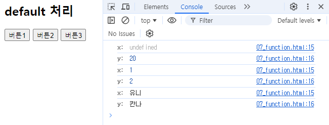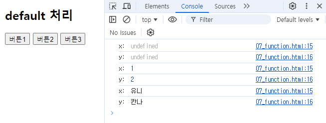 - 매개변수 수보다 더 적은 인자 전달시 부족한 값은 undefined.