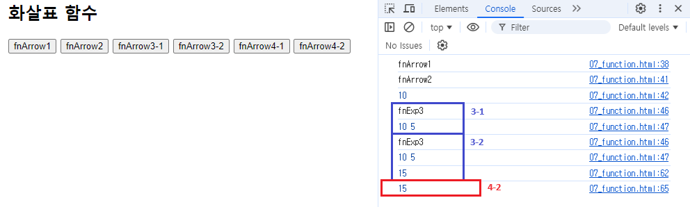 - return한 값을 콘솔에 출력하고 싶다면 onclick="console.log( fnArrow3(10,5) );"