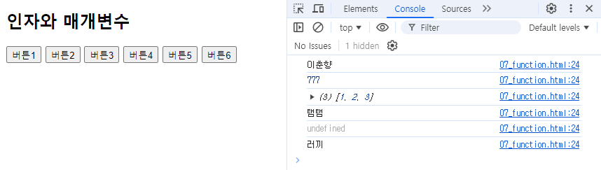 - 자바스크립트는 자유도가 높아서 함수를 호출할 때 매개변수 안줘도 된다. 그러면 전달값이 없으니 undefined.