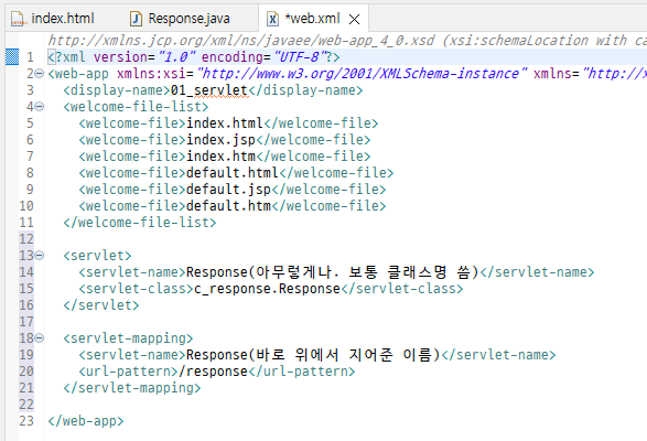 - 그리고 @WebServlet("/Response")를 @WebServlet("/response")로 바꿈.