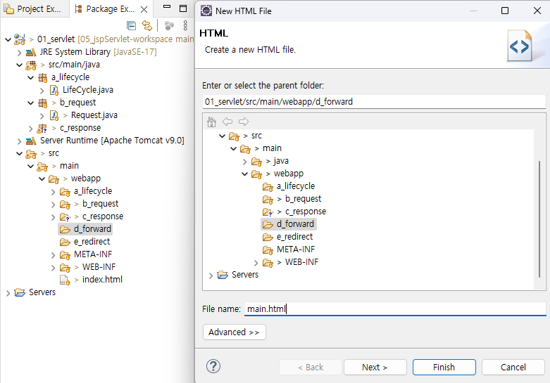 - src/main/webapp 폴더에 d_forward 폴더를 만들고, d_forward 폴더 안에 main.html 만든다.