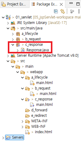 - src/main/java 안에 c_response라는 패키지를 만들고 Response라는 서블릿 클래스를 만듦.