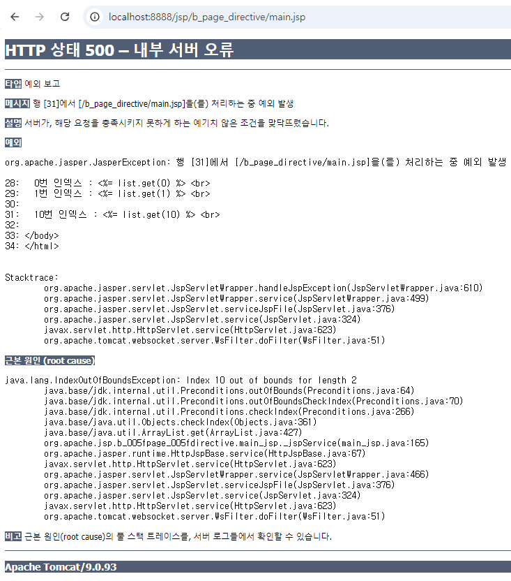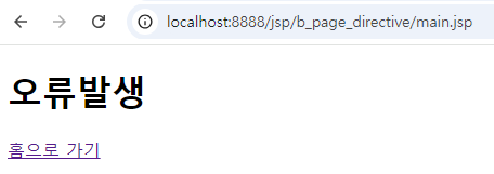 - b_page_directive 폴더의 main.jsp의 페이지 지시어에 아래처럼 errorPage="/b_page_directive/error500.jsp"를 추가한다.