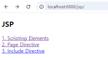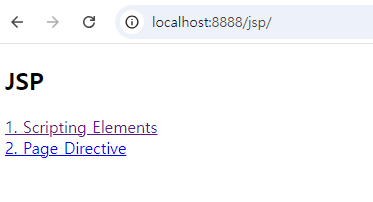 - 다 저장하고, 서버 시작하고 브라우저에 localhost:8888/jsp 하면 이렇게 뜬다.