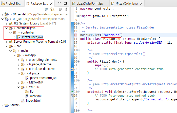 - 이클립스에서 src/main/java에 controller 라는 패키지를 만들고, 그 안에 서블릿으로 PizzaOrder.java를 만든다.