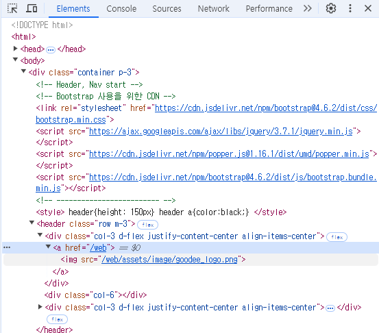 <!-- Bootstrap 사용을 위한 CDN --> <- 부트스트랩 4줄 head 태그에 있던거 추가됨.