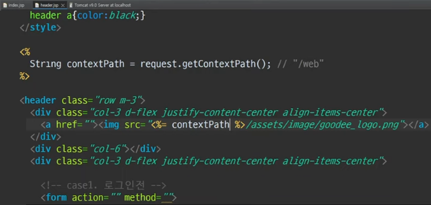 - 그런데 context path를 쓸 일이 많기 때문에 header.jsp 상단에 request.getContextPath()의 값을 변수에 미리 담아둔다.