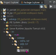 - 참고로 패키지 익스플로러 탭에서는 WEB-INF 폴더 안의 classes 폴더가 보여지지 않는다.