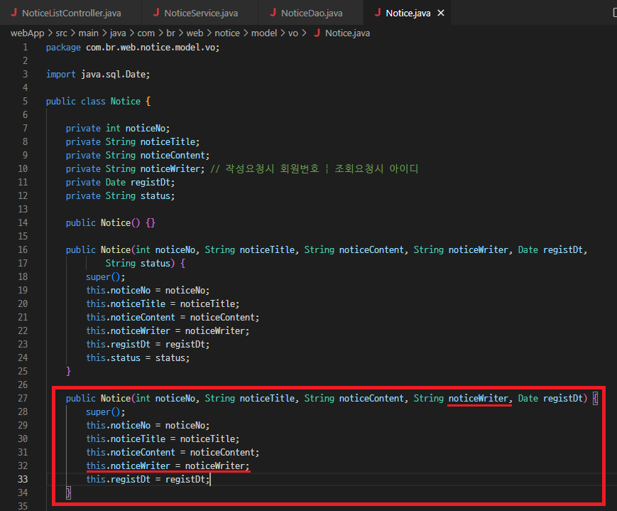 - 5개 필드짜리 생성자를 Notice 객체에 만든다.