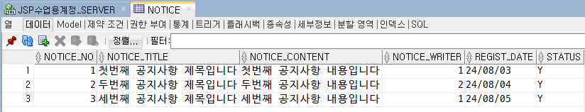 - noticeList.jsp는 DB로부터 select해서 공지사항 데이터를 list에 담아서, request로 보내면서 forwarding 하게끔 작성되어 있다.