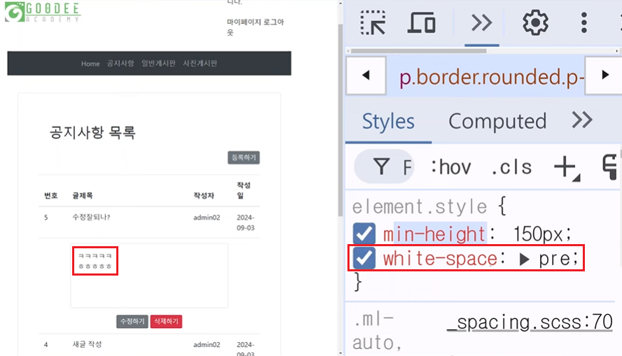 - 공지사항 글내용을 보여주는 <p> 태그에 인라인 스타일로 "white-space: pre;"를 준다.
