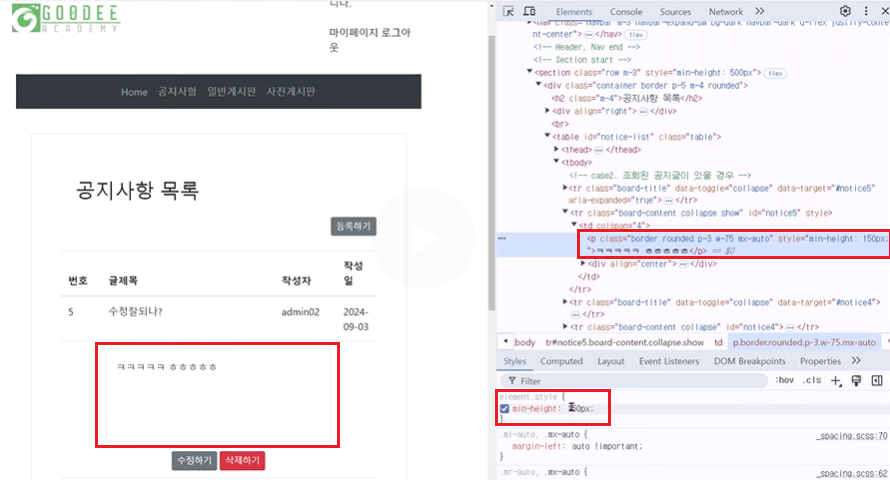 '수정하기', '삭제하기' 버튼이 보여지게끔 noticeList.jsp를 구성했었다.