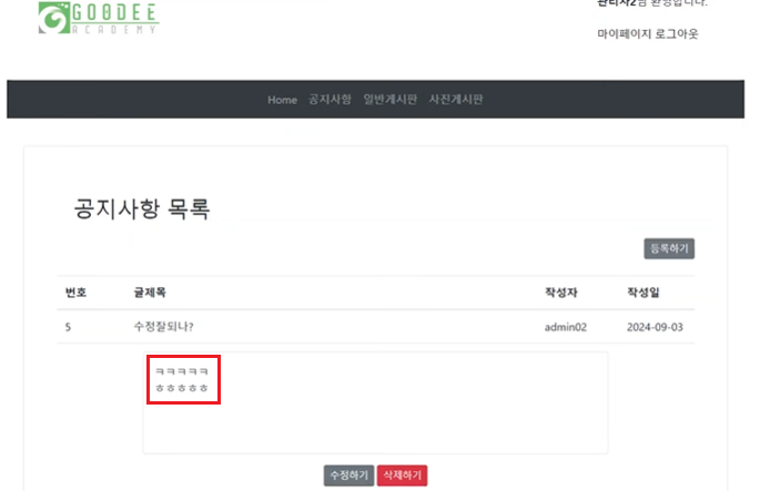 공지사항 목록페이지에서 내가 쓴 글에서 '수정하기' 버튼을 누르면 공지사항 수정페이지로 이동된다.
