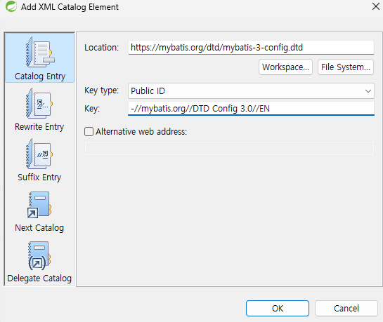 - Location에 http://mybatis.org/dtd/mybatis-3-config.dtd