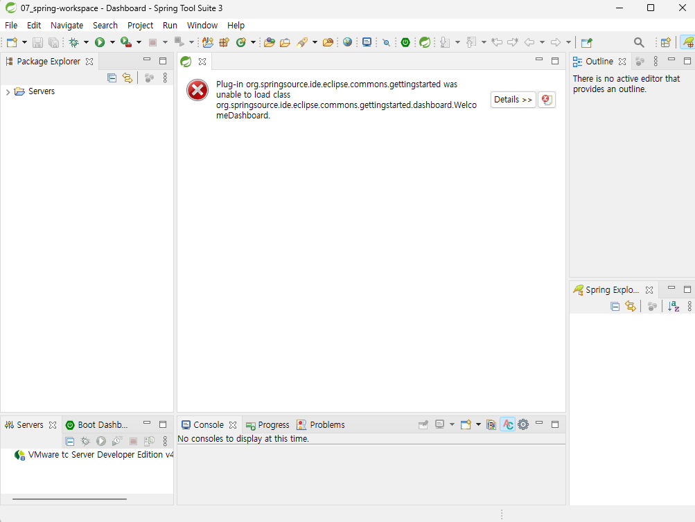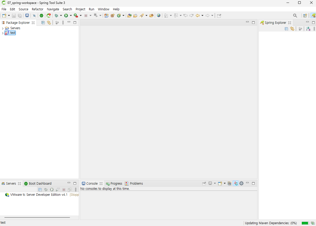 - Spring Explorer는 잘 보진 않는다. 꺼도 되고 패키지 익스플로러 옆에 둬도 된다.