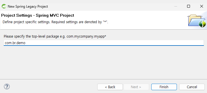 - 오류가 나지 않고 잘 넘어와진다. 패키지로 com.br.demo를 작성하고 Finish한다.