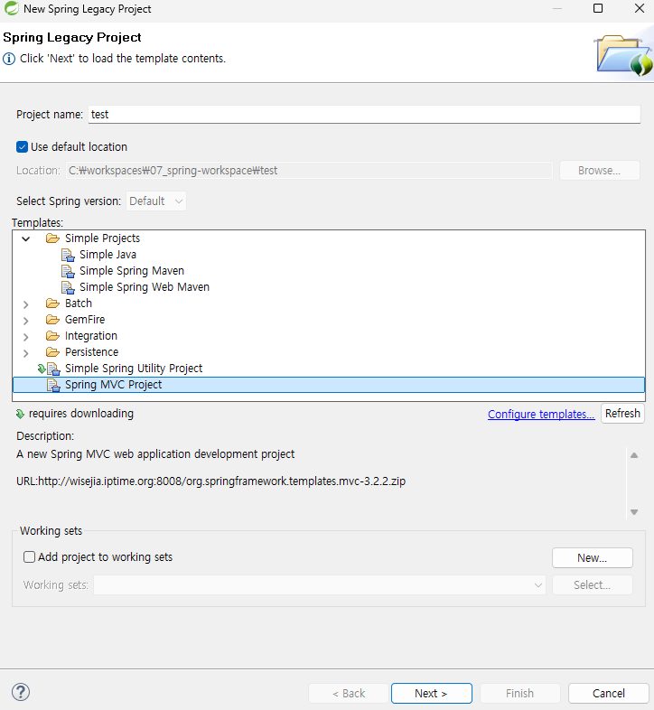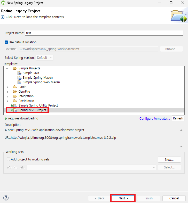 - 프로젝트 이름으로 "test"를 작성하고, Spring MVC Project를 선택하고 Next를 누른다.