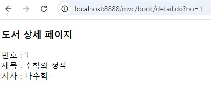 - 리다이렉트할 때 redirect:/book/detail.do?no=1는 실제로 http://localhost:8888/mvc/book/detail.do?no=1로 요청이 전송됩니다.