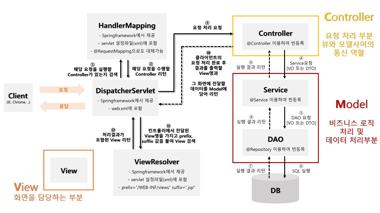 view -> request -> DispatcherServlet -> Controller -> Service -> Dao (쿼리 실행)