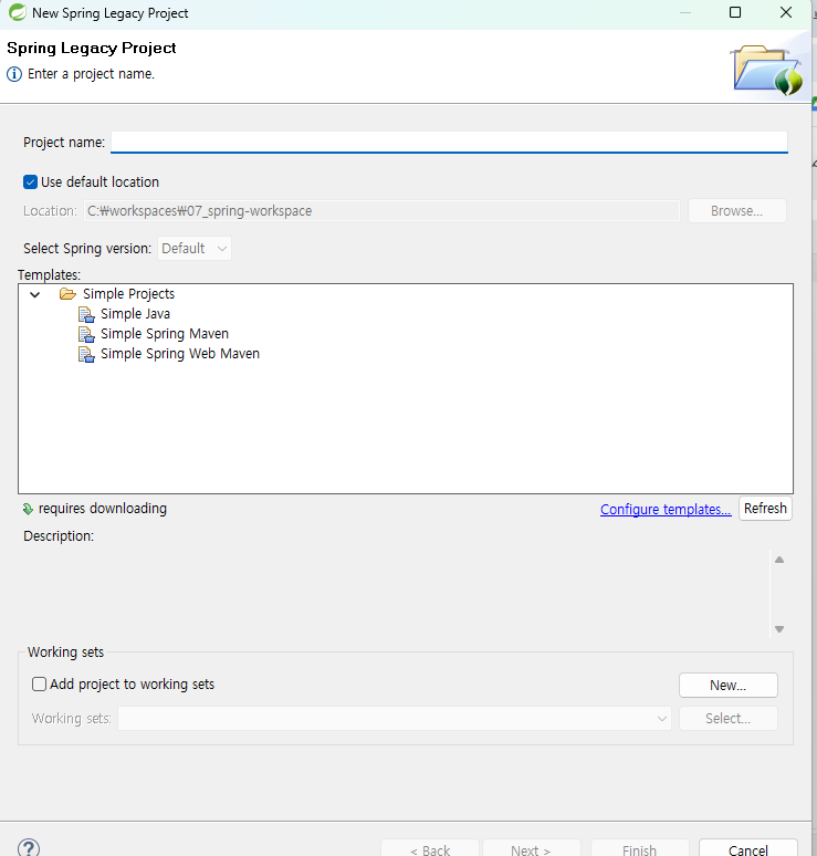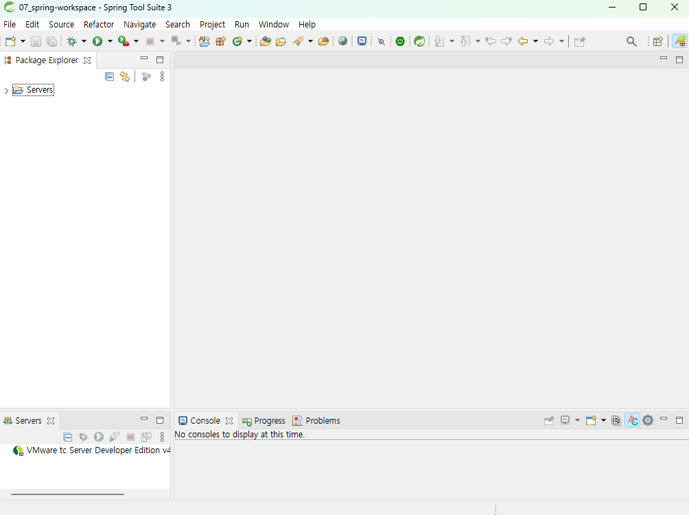 - C:\workspaces\07_spring-workspace 폴더에 프로젝트 폴더들이 있지만 패키지 익스플로러에는 아무것도 안보인다.