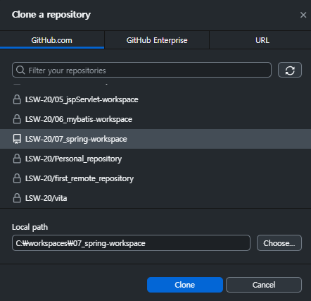 - file - clone a repository - 07_spring-workspace 선택