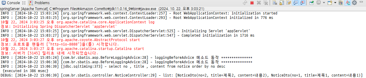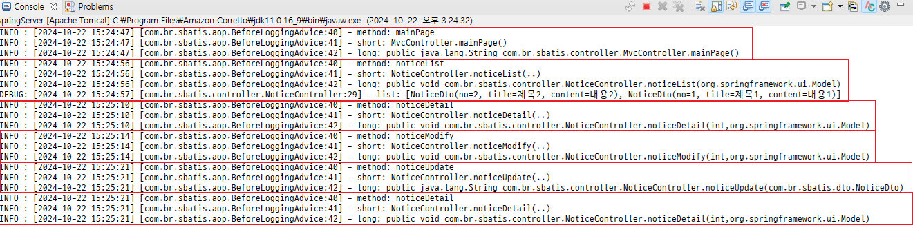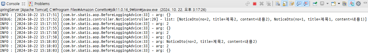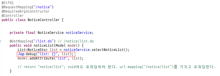 - noticeList 메소드에는 이미 로그 출력문이 있다. 비교해본다.