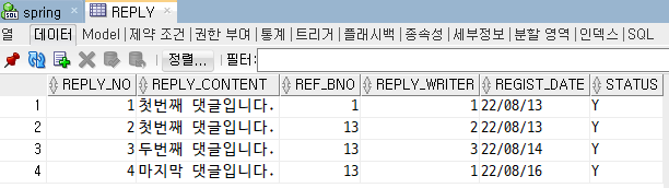 VALUES(SEQ_RNO.NEXTVAL, '첫번째 댓글입니다.', 1, 1, '20220813', DEFAULT);