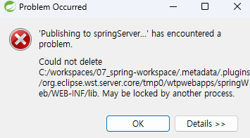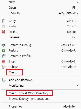 - 서버 클린, 서버 톰캣 클린, 프로젝트 클린, 프로젝트 메이븐 업데이트 + 재부팅 + 서버 삭제 후 다시 추가