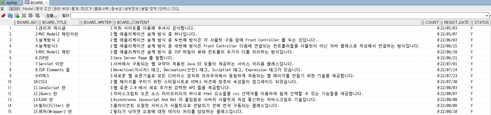 VALUES(SEQ_BNO.NEXTVAL, 'MVC Model1 패턴', 3,