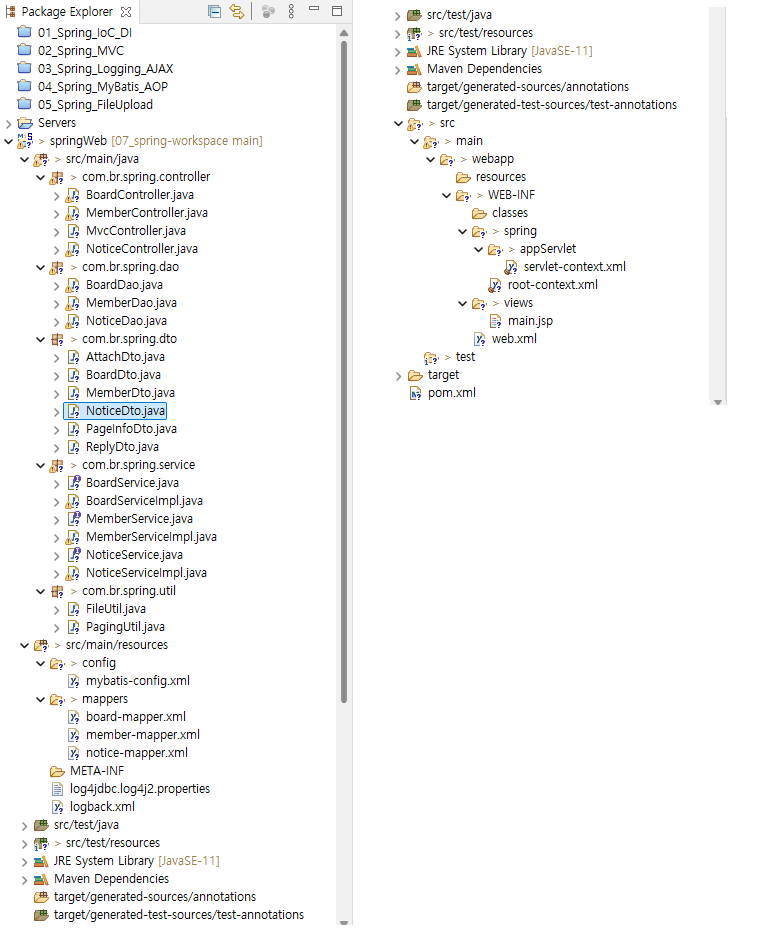 - 위에처럼 있는데 아래로 변경한다. com.br.file.service~를 com.br.spring.service~로 작성.