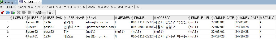 int result = memberDao.updateMember(m); // 문제없다면 1로 돌아올 것이다. 변경될 데이터도 딱히 제약조건에 위배되는 데이터가 아니다.