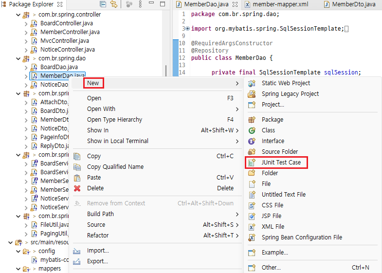 - 참고로 MemberDao는 SqlSessionTemplate 객체를 주입받고 있다. 이 객체가 필요하다.