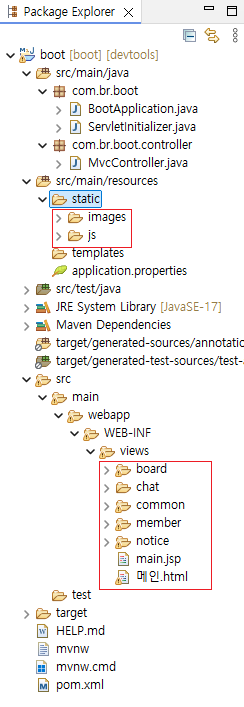 - 저 2개의 폴더를 STS4 패키지 익스플로러의 src/main/resources/static에 붙여넣기 한다.