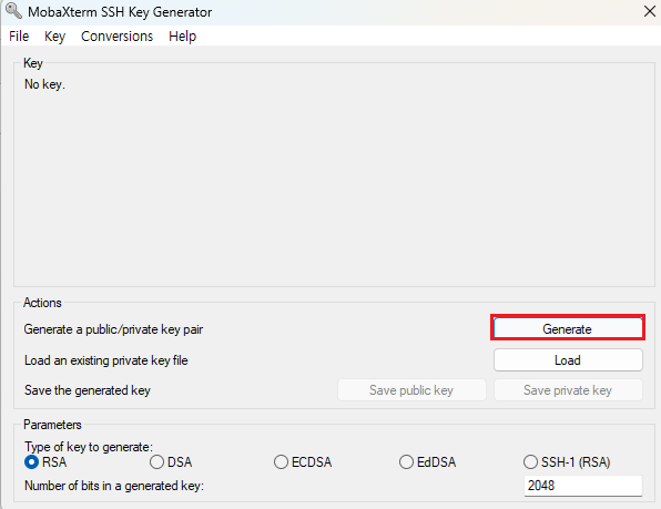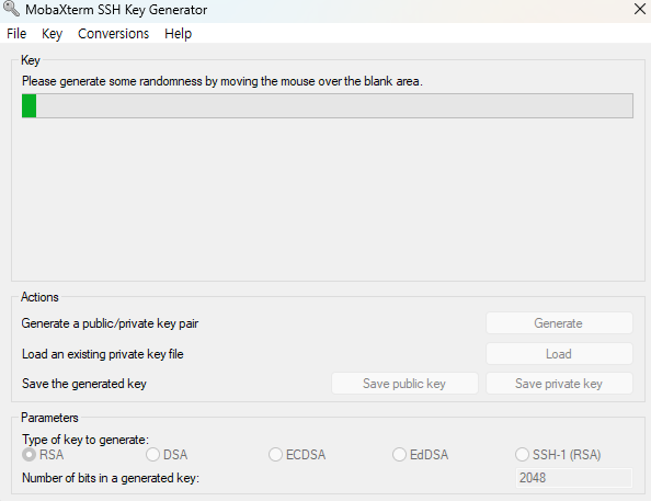 - 상단의 Tools 메뉴 - MobaKeyGen (SSH key generator)를 클릭한다.