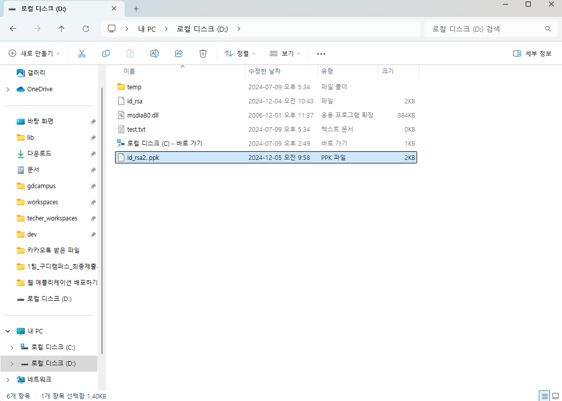 - d드라이브에 이름을 id_rsa2, 파일 형식은 모든 파일로 선택하고 저장했다.
