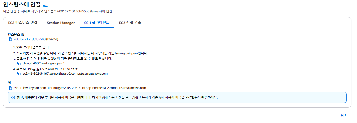 - cmd 창에서 접속할 경우에 chmod 400 "lsw-keypair.pem"를 먼저 해야한다.