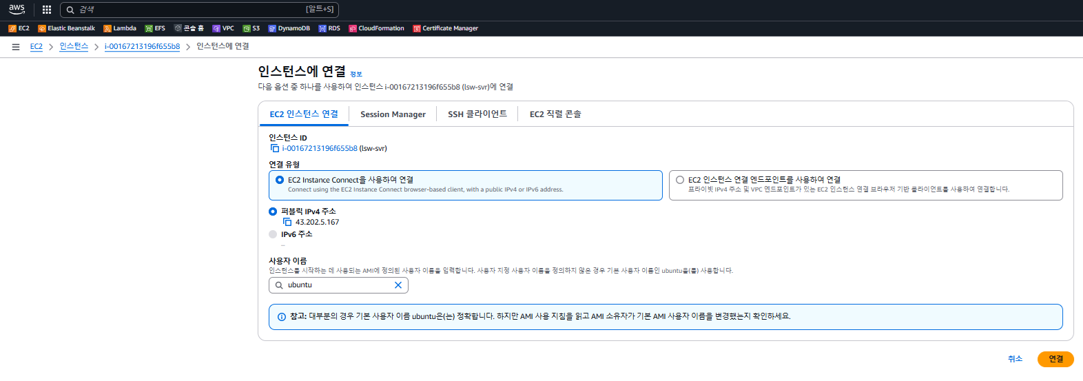 - 아니면 이름 주소 대신에 아까 인스턴스 요약에서 봤던 퍼블릭 IPv4 주소인 43.202.5.167를 입력해도 된다.