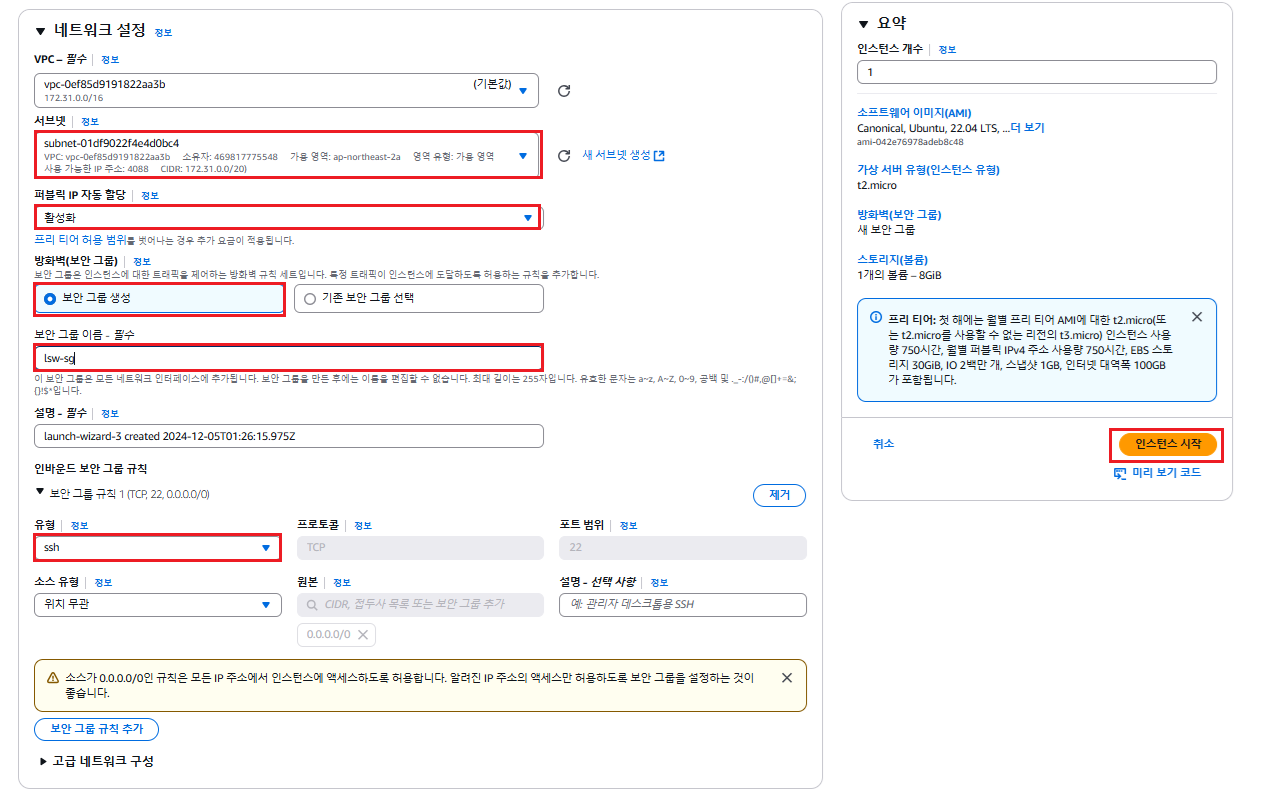 - 방화벽(보안 그룹)은 이미 보안 그룹 생성이 선택되어 있다. 그대로 둔다.