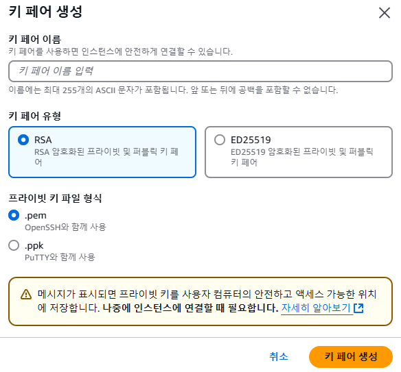 - 키 페어 유형은 RSA로 한다.