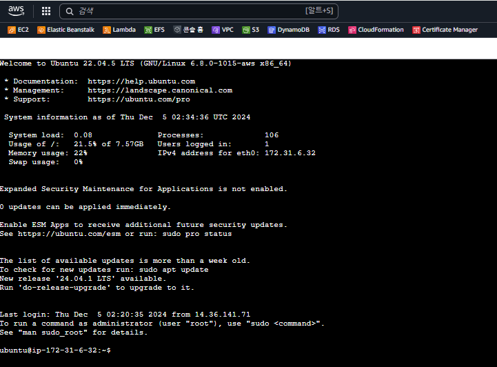 - EC2 인스턴스 연결 탭에서 연결 버튼을 누르면 브라우저에서 접속된다.