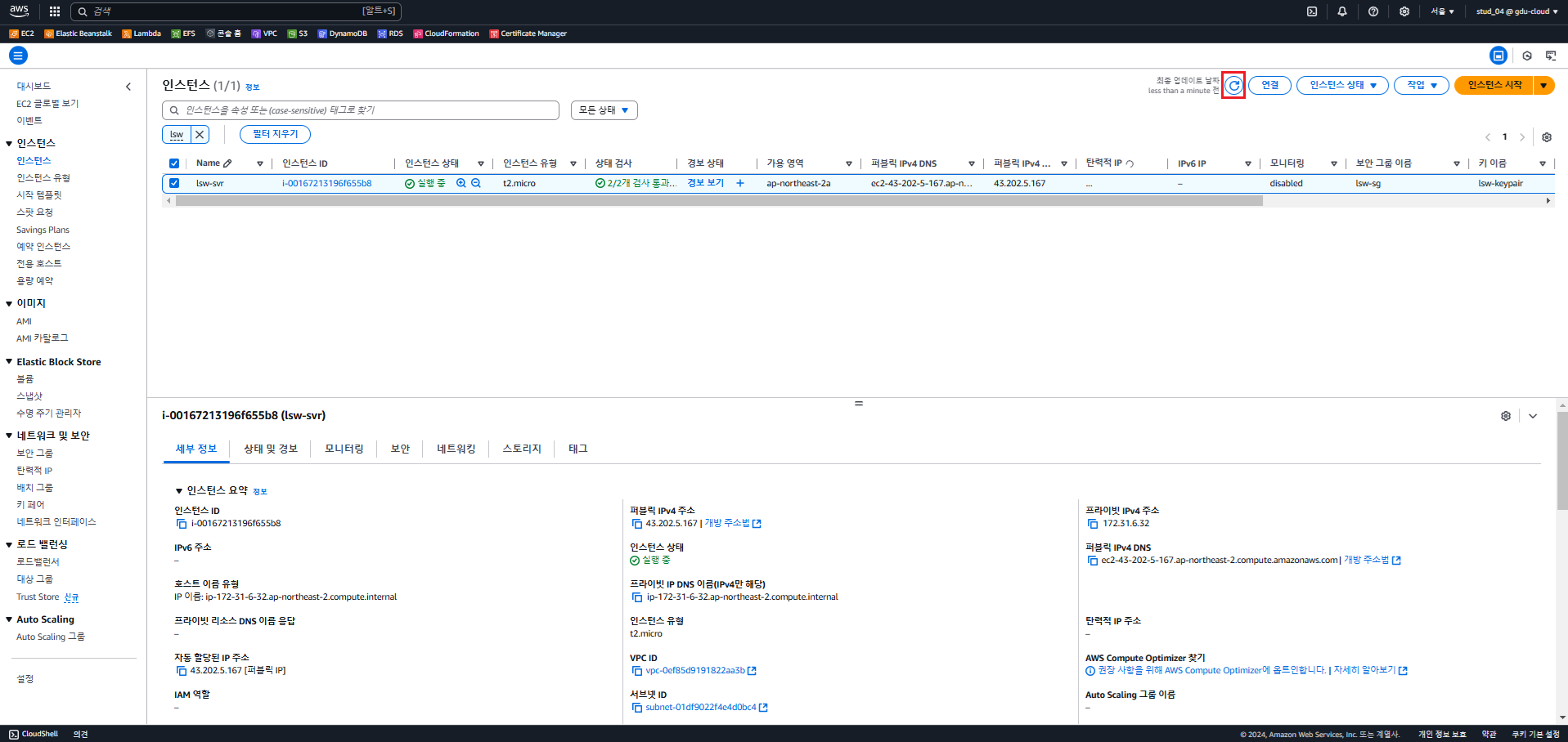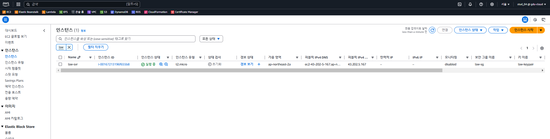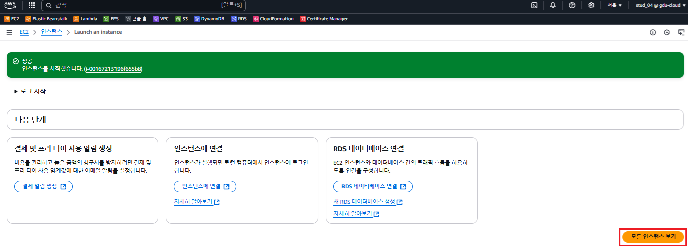 - 인스턴스 시작을 누른다. 3분정도 걸린다.