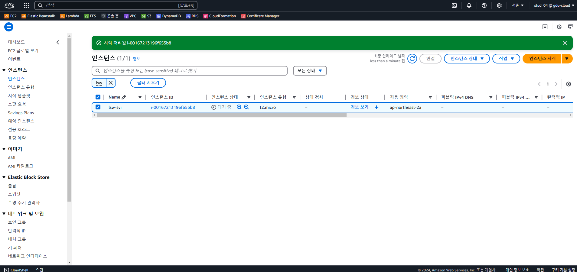 - 자기 이니셜-svr이 서버다. 왼쪾 체크박스 선택하고 인스턴스 상태보면 6개가 있는데 종료하기 누르면 삭제다. 인스턴스 시작을 누른다.
