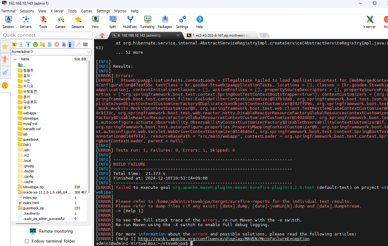 - 빌드하면서 테스트를 한다. 웹 애플리케이션을 실행해보면ㅅ ㅓ정상적으로 되는지 테스트를 해보는데, 지금 디비가 버츄얼박으의 디빅 ㅏ아니라 aws에 설치한 디비르릈ㄹ거라 ip를 바꿨다. 그런데 디비가 없으니 에러가 나는거죠.