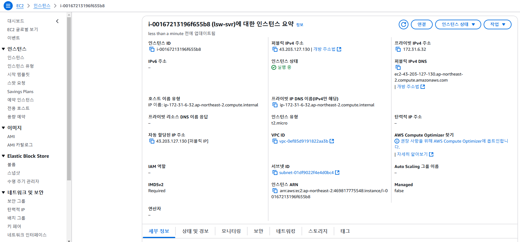 - EC2의 퍼블릭 IP 또는 DNS 주소를 사용해야 외부에서 접속이 가능합니다.