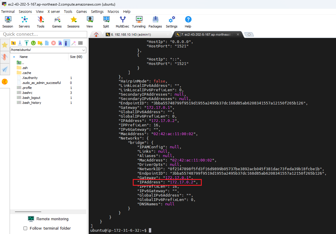 - 172.17.0.7은 로컬 Docker 네트워크의 오라클 컨테이너 IP였음.