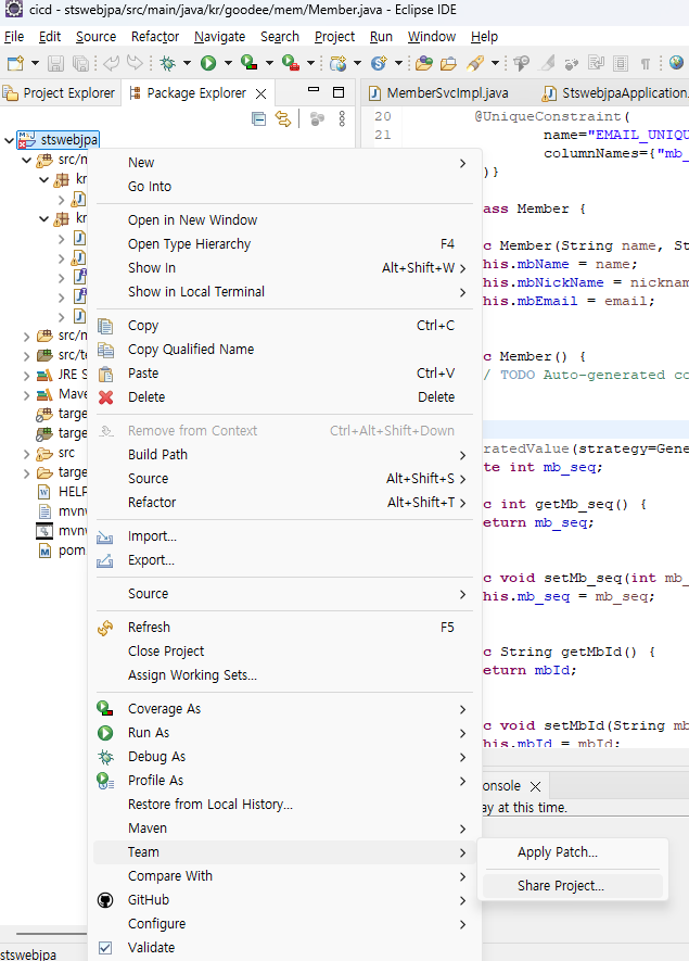 - 프로젝트 우클릭 - Team - share project..