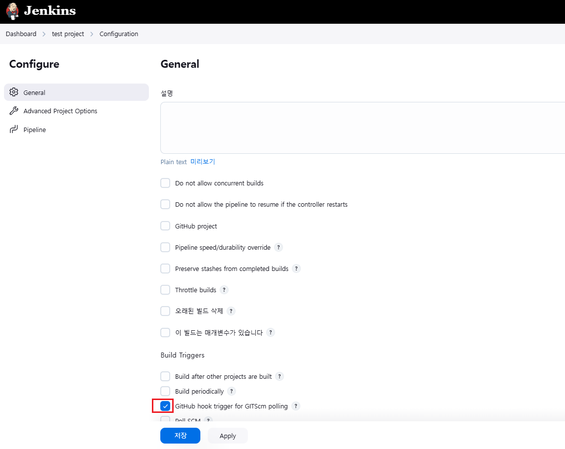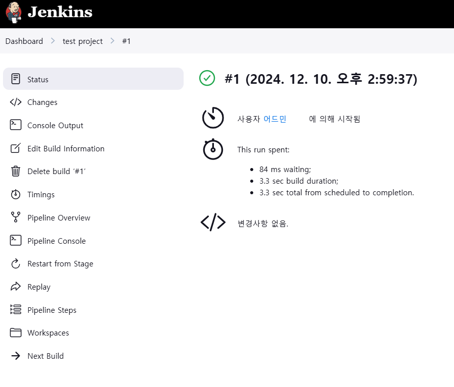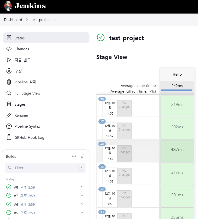 - 여기서 초록색 체크표시가 떠야 한다. 깃허브와 젠킨스가 통신이 된다는 뜻이다.