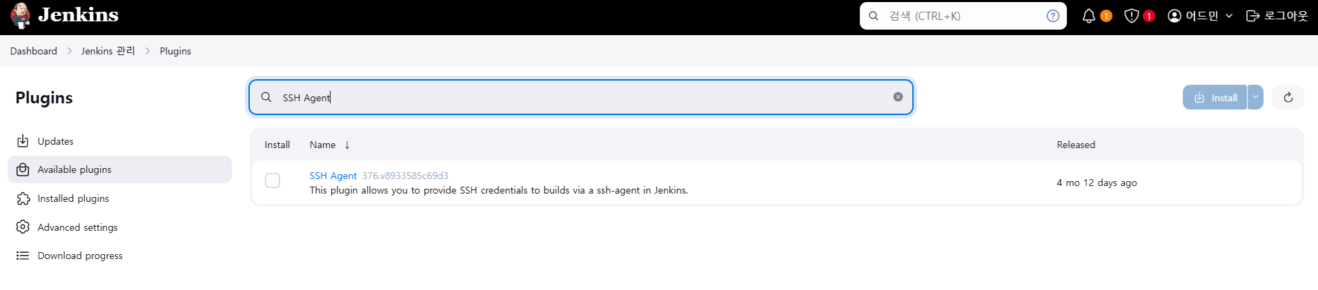 - available plugin에서 검색해서 왼쪾 체큽작수 누르고 인스톨한다.